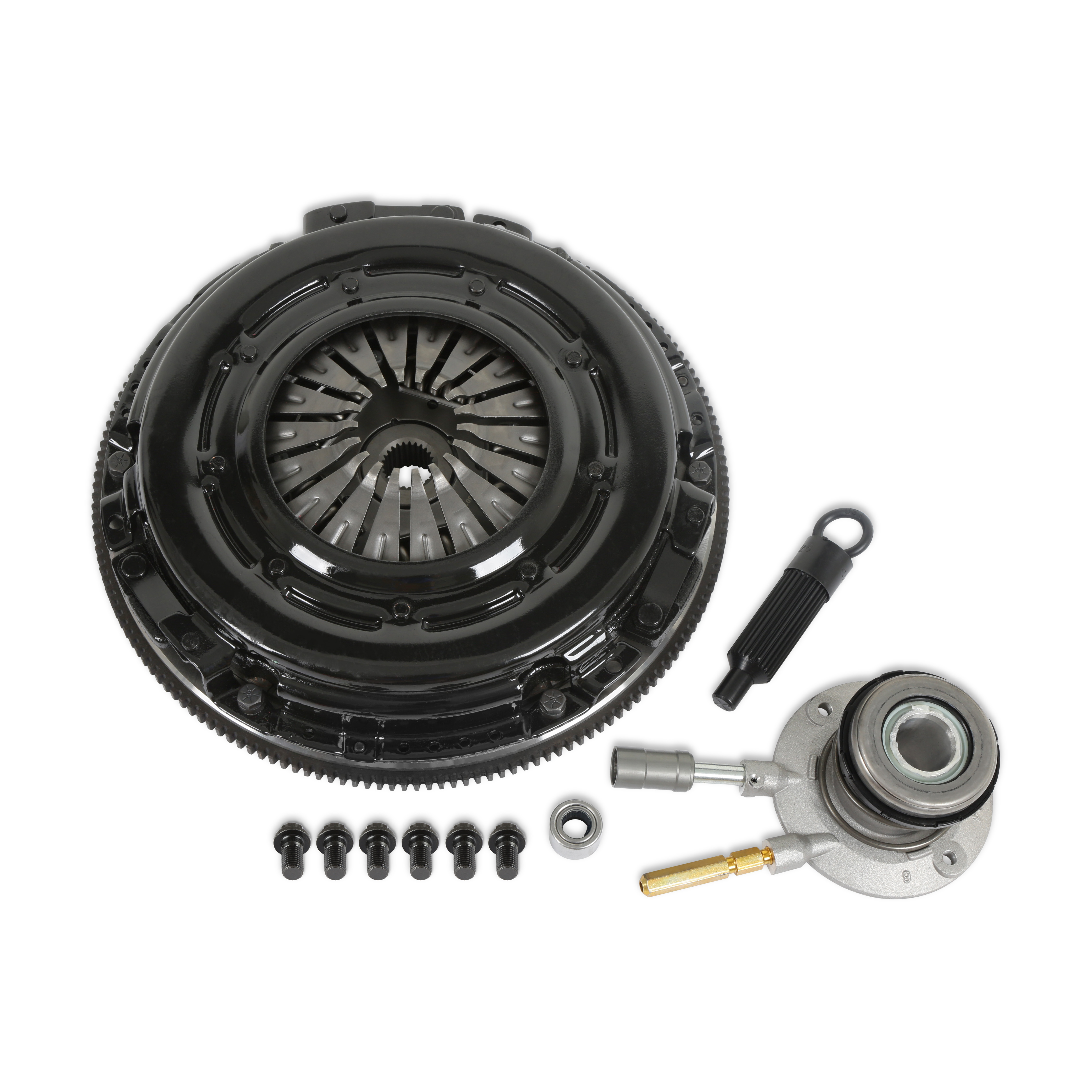 - Includes Pressure Plate, Disk, Flywheel, Alignment Tool, Pilot Bearing, Pressure Plate Bolts, Flywheel Bolts and Hydraulic release bearing (hydraulic release bearing to transmission bolts not included)