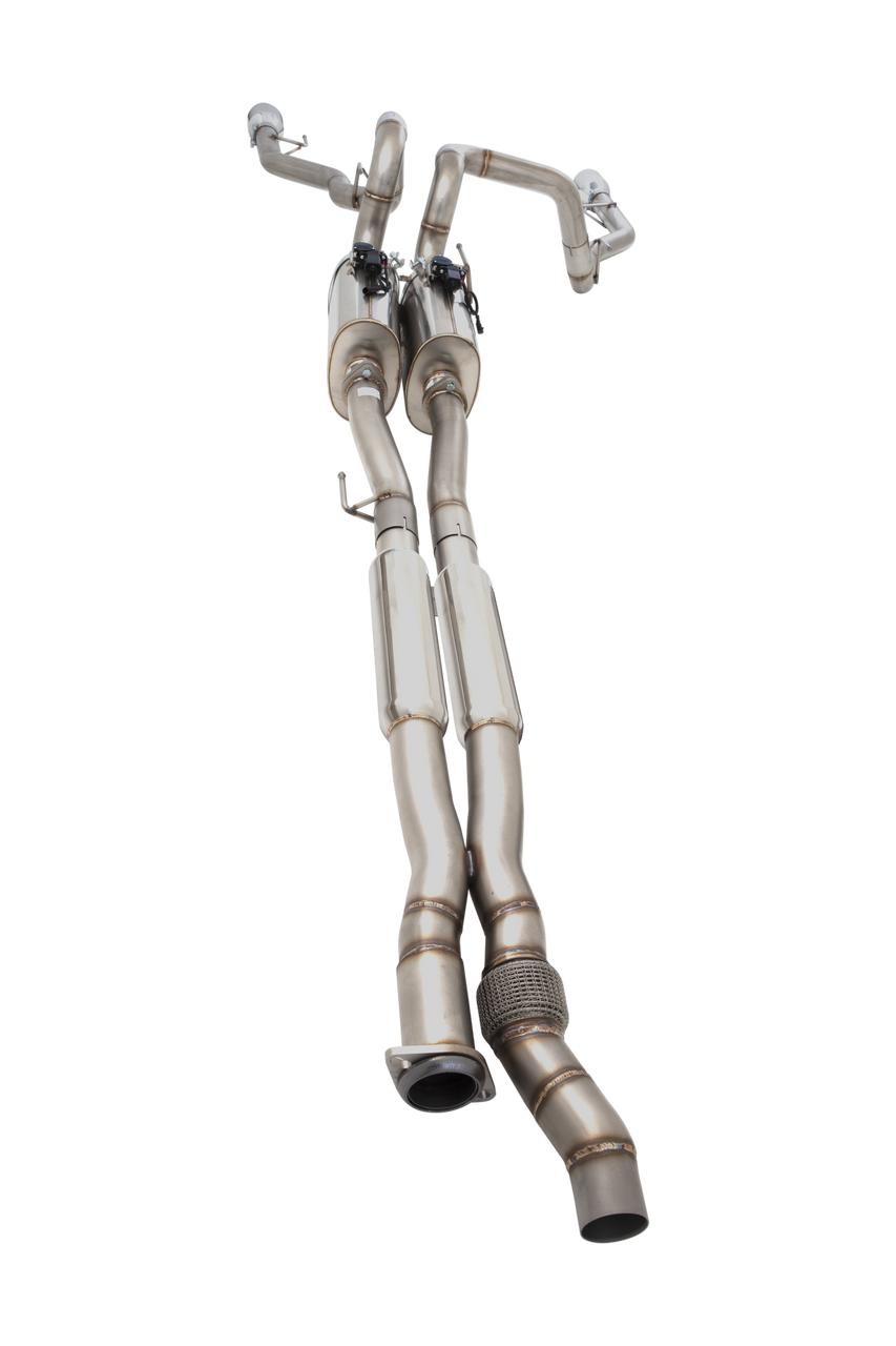 VAREX remotely adjustable mufflers utilize our patented technology to combine both the design of a stock muffler and a performance muffler into one single compact unit. A sophisticated, electronically controlled butterfly valve mechanism is implemented to redirect the exhaust gas flow and vary between the two muffler types. For a louder, more aggressive sound level, the exhaust flow is directed through the open path, producing maximum power with a robust sound level and near-zero resistance. For a lower sound level, the exhaust flow is directed through the chambered path (similar design as the stock muffler), producing a minimum sound level that gives you the best in-car comfort. The angle of the valve is controllable and can be adjusted to stop at various points between sports mode and silence mode. This gives you further freedom to set the optimal sound level according to your desired preference. The VAREX motor and gear sets are located on the top of the muffler, they work as an integrated unit to drive the butterfly valve open and close. The VAREX control unit features durable construction with water resistant plugs. Easy Installation, no hard-wiring required (in-car 12V socket included) for plug and play functionality. Stylish remote key fob included. Dual muffler control harness is available (sold separately). Ford F150 2017-2020 Raptor V6 3.5L Twin Turbo Varex Catback